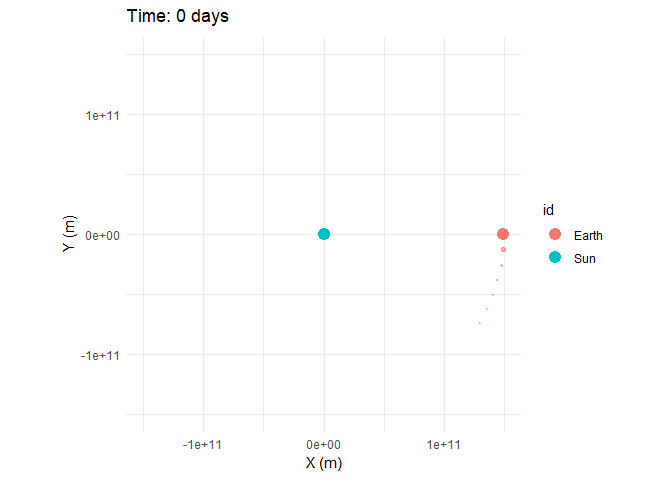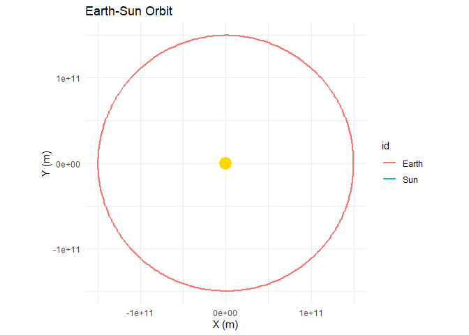 You’ll notice only Earth’s orbit is visible — the Sun is missing. That’s a limitation of plot_orbits(): it draws trajectories using geom_path(), and the Sun barely moves during the simulation so its path is too small to see at this scale. The Sun does move — Newton’s third law means Earth pulls on the Sun just as the Sun pulls on Earth, causing it to trace a tiny loop around the system’s barycenter. It’s just invisible at this zoom level because the Sun is ~330,000 times more massive than the Earth. This stellar wobble is real, though — it’s exactly the method astronomers use to detect exoplanets.