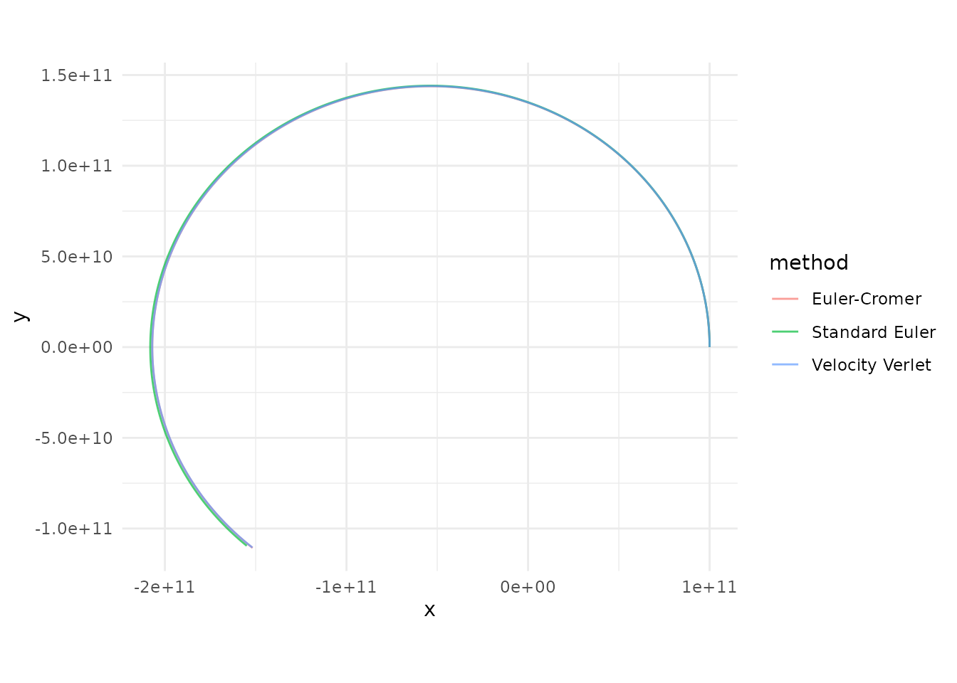 euler_cromer <- simulate_system(system, time_step = 3600, duration = 86400 * 365, method = "euler_cromer") |>